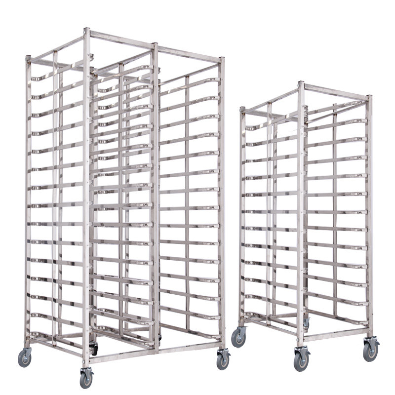 Un bastidor de bandejas de horneado de acero inoxidable de varias capas con ruedas, también conocido como bastidor de secado de pan o bastidor de hojas de horneado,es una solución versátil de almacenamiento y organización comúnmente utilizada en panaderías comerciales o cocinas domésticasEstá diseñado para contener múltiples bandejas o hojas de horneado, lo que permite una enfriamiento, secado y almacenamiento eficientes de productos horneados.Estas son algunas de las características y beneficios principales de un bastidor de bandejas de horneado de acero inoxidable multicapa con ruedas: